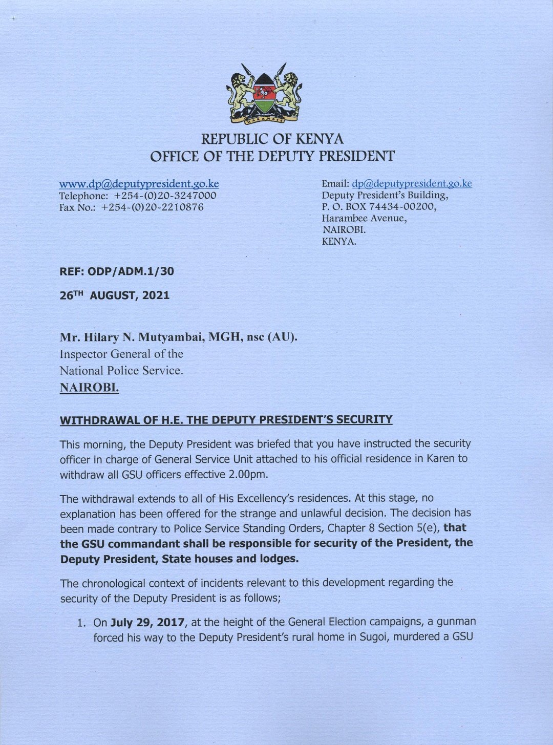 Government side remains tight-lipped on the matter. Deputy President William Ruto has protested against the withdrawal of GSU officers from his Karen residence and replacement with officers from the Security. The security personnel who were handling his security matters were notified to vacate all premises owned or occupied by Ruto by 2 pm today 2682021.